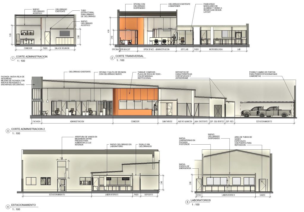 Se realizó el proyecto de la nueva área administrativa a reubicar en un local contiguo al laboratorio existente el cual se encontraba vacío. Asimismo se readecuaron las areas de recepción, se agregaron cinco nuevos laboratorios, como así también la re funcionalización del área de recepción de muestras, depósitos,  sector de carga y descarga de materiales y estacionamientos.