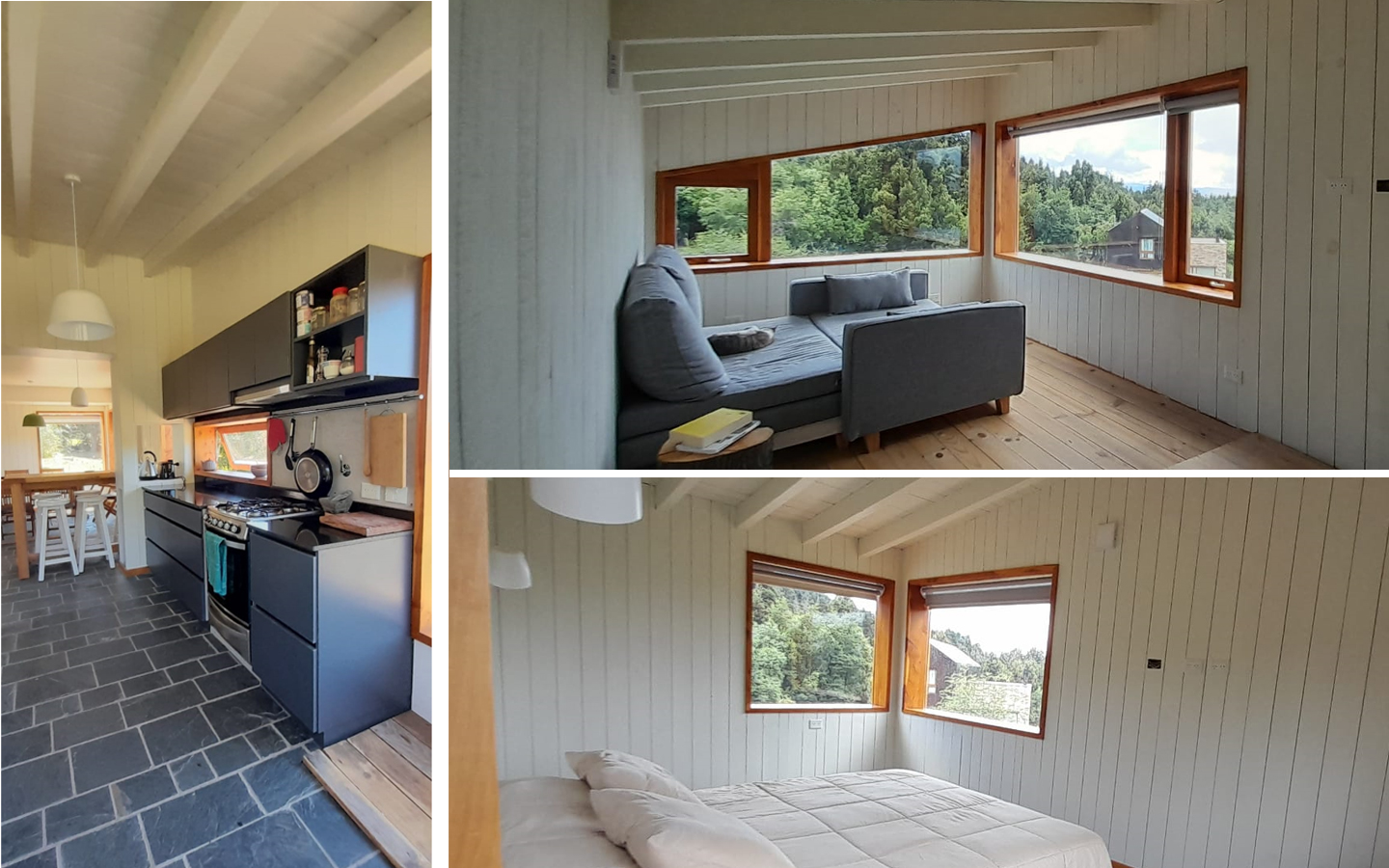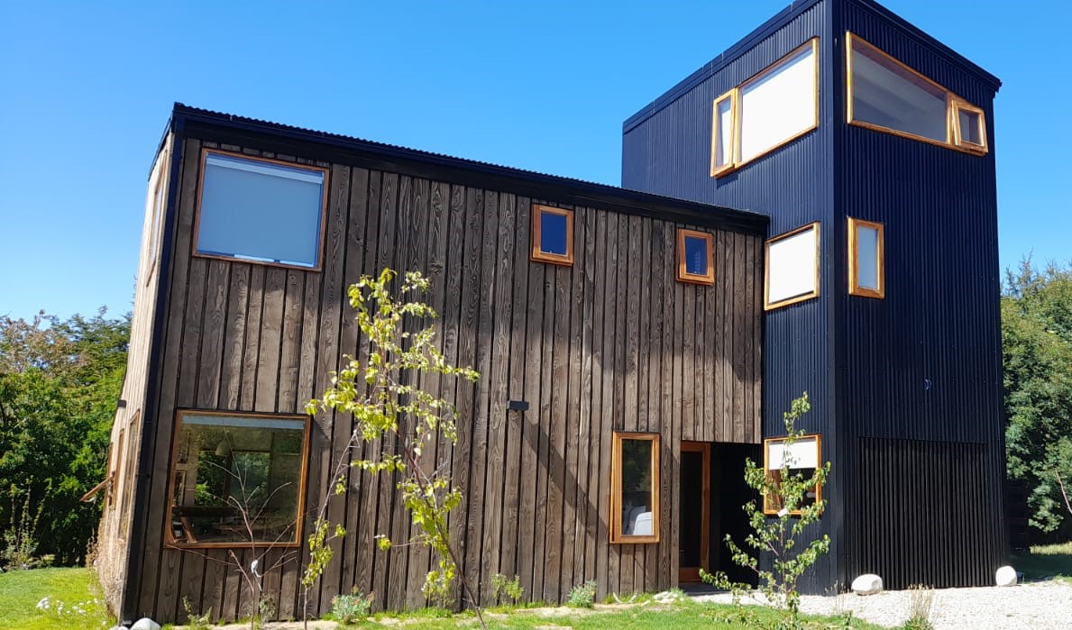 La casa está construida completamente en madera bajo el sistema de Platform frame, Esta revestida en su exterior con tablas de madera de pino verticales teñidas de oscuro y chapa acanalada negra. Las carpinterías son de ciprés. El interior se revistió con machimbre vertical.
